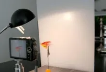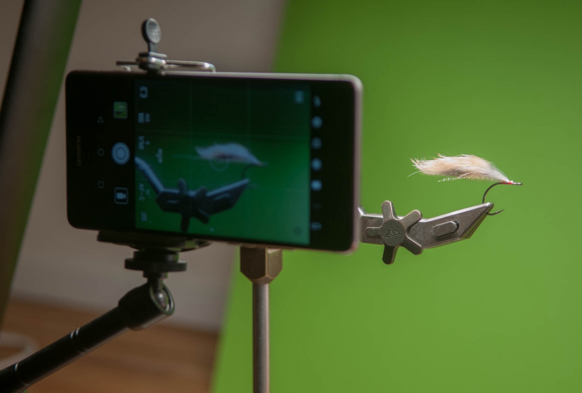 If you shoot away from yourself, having the camera between yourself and the fly, make sure you have a large piece of cardboard or something similar set up as a background. It must fill out the whole background, and not just be a white patch behind the fly itself with your messy office, tying table or living room visible in the background. You might find your tying environment tidy, but visually it's messy.
