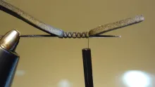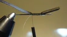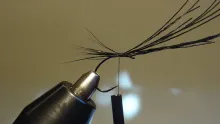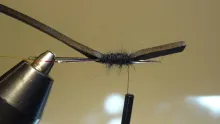 Dmitri forms a compound body and shell consisting of foam, dubbing and a rib, and does so on a needle in such a fashion that the finished body/shell can be slid off the needle and tied in on the hook in a manner that reminds of the foam bodied mayflies seen quite often. But once the body has been secured, Dmitri bends the foam back over the body and ties it down, forming a shell and providing a lot of buoyancy in the fly. Since the hook is fairly short and winds up “hanging” under the body in the surface, the fly ends up with an almost detached hook and a fairly large gape leading to good hooking abilities.